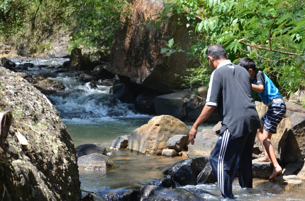 Sambil saling berpegangan dengan perantara ranting pohon, kami terus menuruni bukit melewati celah-celah pohon yang rapat hingga sampai di sungai berair jernih dan berbatu. Senangnya bukan main. Kami berenang di sebuah cerukan batu, meluncur dan berendam. Tetap harus hati-hati. Kalau tidak, arus akan membawa kami jatuh di air terjun yang tak jauh dari lokasi kami berada.